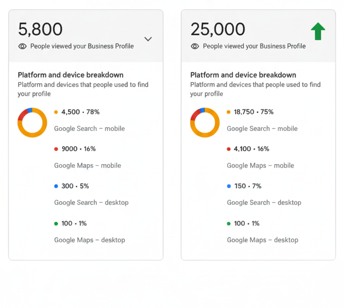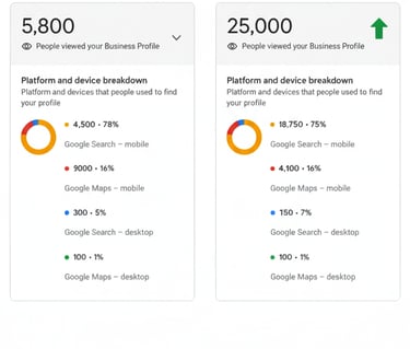 A local Google Business Profile transformation that increased visibility, profile views, and customer actions by optimizing search presence, categories, and local signals.